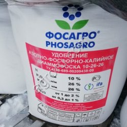 Диаммофоска NPK (S) 10:26:26(2) со склада доставка по России. Гидрофосфат аммония (диаммонийфосфат, диаммофос) водорастворимая соль, образующаяся при взаимодействии аммиака и фосфорной кислоты. Применяется как сложное (комплексное) концентрированное фосфорно-азотное удобрение. При внесении в почву повышает её pH (увеличение основности), но через длительный период начинает уменьшать pH (увеличение кислотности) почвы за счёт окисления аммония (NH4+) в азот. Карбамид ГОСТ , Марка Б, упаковка п/п мешки по 50 кг. Цена на самовывоз о,00 руб/тн с НДС. Селитра аммиачная ГОСТ 2-2013, упаковка биг-бег 800 кг или п/п мешки по 50 кг. В наличие другие азотные и сложные удобрения в ассортименте. Сульфоаммофос NP (S) 20:20(14), Аммофос MAP 12:52, Диаммофоска NPK (S) 10:26:26(2), Азофоска 15:15:15(10) нитроаммофоска, NPK(S), Азотно-фосфорно-калийное NPK 12:32:16.