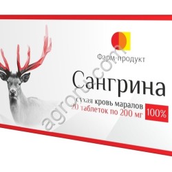Сангрина (сухая кровь марала) применяется внутрь в качестве дополнительного источника железа.Восполняет недостаток железа в крови человека, повышает физическую работоспособность, а так же увиличевает потенцию и укрепляет иммунитет.