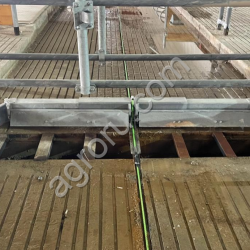 Программируемый щит управления с возможностью установки периодичности уборки навоза, интеллектуальная системой распознавания, лежащего животного на пути скрепера, автоматический режим работы . На одном кольце две независимые приводные станции 0,75 кВт. Поворотные блоки с роликами из римамида. Направляющий ложемент для скрепера 3мм 60х50х60.