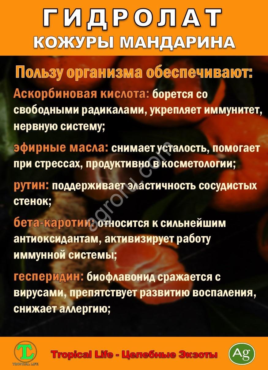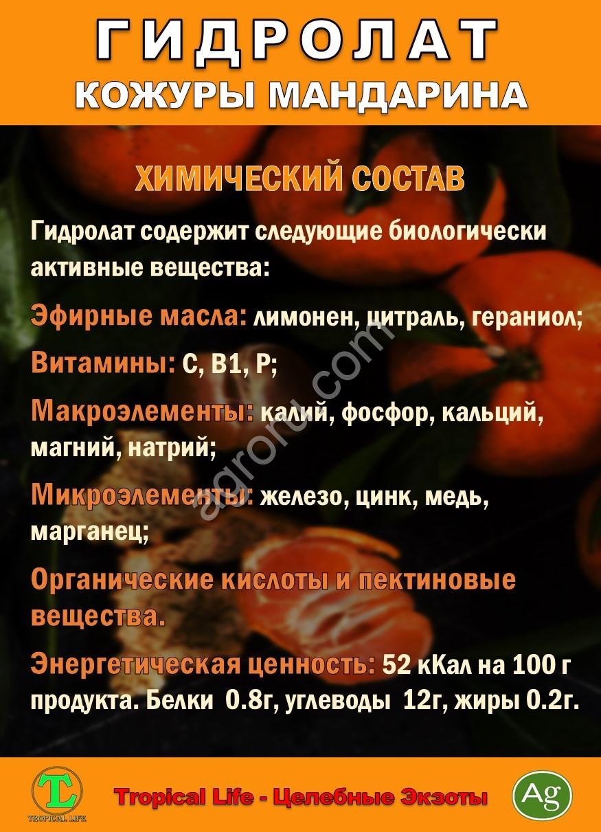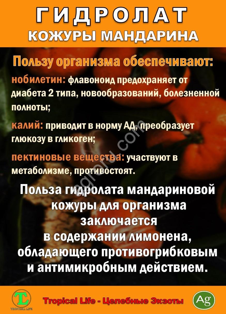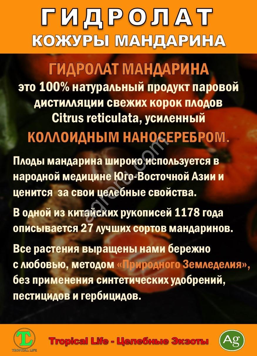 Гидролат кожуры мандарина это ароматическая вода, получаемая методом паровой дистилляции кожуры плодов мандарина (Citrus reticulata).