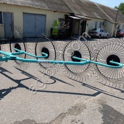 Грабли-ворошилки ; Кормилец; 5-ти колесные, выполнены по образу турецких граблей, с улучшением 3 параметров: - использование проволоки для пальцев толщиной 7мм, а так же при нашей технологии обработки эти пальцы стали гораздо жёстче и крепче, по сравнению с турецким оригиналом; - использованы автомобильные ступицы с коническим подшипником, запас прочности автомобильных ступиц позволяет говорить о том, что этот узел стал quot;не убиваемquot;; - для изготовления опорной пластины граблей был использован металлический лист толщиной 10 мм. Это позволило избежать деформации опорной пластины граблей при движении в транспортировочном положении.
