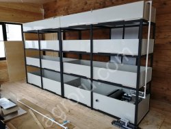 Модули для выращивания креветок; представляющие собой, стойку в виде шести емкостей сдвоенных между собой , прямоугольной формы, выполненных из полипропилена толщиной 8 мм. (марка VIKULEN) и размещенных на трёх уровнях металло-каркаса. Модуль автономен полностью, но позволяет включить неограниченное кол-во дополнительных модулей с подключением оборудования водоочистки и водоподготовки. Модули УЗВ сконструированы таким образом, чтобы обслуживание и уход были минимальными. Учитывая автоматическую работу системы циркуляции, ее техническое обслуживание сводится только к периодическому визуальному контролю.