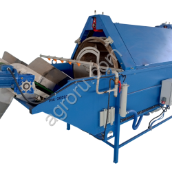 Конструкция выполнена в виде вращающегося барабана с направляющими внутри. Очистка осуществляется при помощи воды и трения корнеплодов при продвижении к точке выгрузки. Подключается к транспортеру, для регулировки объема продукта на выходе используется заслонка. На выходе к выгрузному устройству находятся форсунки для очистки овощей. Отвод загрязнений, воды и грунта из барабана проводятся непрерывно при использовании оборудования. Полный слив воды из емкости выполняется после остановки комплекса или при сильном загрязнении.