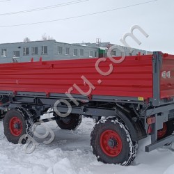 Назначение: прицеп тракторный самосвальный 2ПТС-4,5 предназначен для перевозки различных сельскохозяйственных и сыпучих строительных грузов по дорогам общей сети и в полевых условиях. Разгрузка прицепа трёхсторонняя. Прицеп агрегатируется с колёсными тракторами тягового класса 1,4т оборудованными раздельно-агрегатной гидросистемой, имеющими тягово-сцепное устройство по ГОСТ 2349, а также выводы для подключения тормозной пневмосистемы и электрооборудования.
