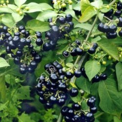 Паслен садовый крупноплодный Санберри - редкое однолетнее ягодное и лекарственное растение. Кусты высотой до 1,5 м. С куста собирают полведра ягод размером с вишню. Они используются для приготовления варенья, киселей, начинки пирогов, вареников, их можно сушить. В Сибири выращивается в открытом грунте через рассаду, сеять в апреле.