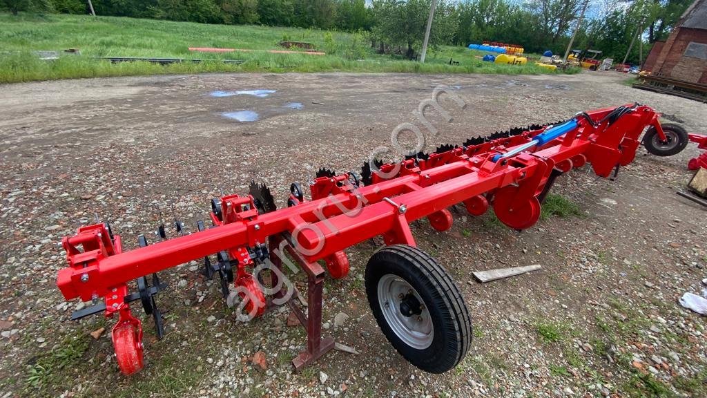 Рабочие органы – S-образные стойки на параллелограммной секции с регулируемым опорным атмосферным (либо металлическим, на выбор заказчика) колесом. S-образные стойки фирмы Ofas (Италия) укомплектовываются фирменной лапой 150 мм (по заказу 105 мм, 200 мм) или долотом 40 мм. Параллелограммное устройство культиватора обеспечивает точное копирование рельефа почвы.