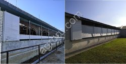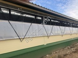 Ветрозащитные шторы для вентиляции животноводческих помещений. Использование специальных материалов обеспечивает достаточное естественное освещение внутри здания и надежную защиту от ультрафиолета и атмосферных воздействий (ветер, дождь, снег и т. д.).