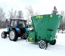 Смеситель-раздатчик кормов СРВ-8 предназначен для приготовления (разрыхления, частичного измельчения и смешивания) и раздачи компонентов (зеленая масса, силос, сенаж, рассыпное и прессованное сено, жидкие кормовые добавки) без устройства самозагрузки, с применением электронной системы взвешивания компонентов кормовой смеси